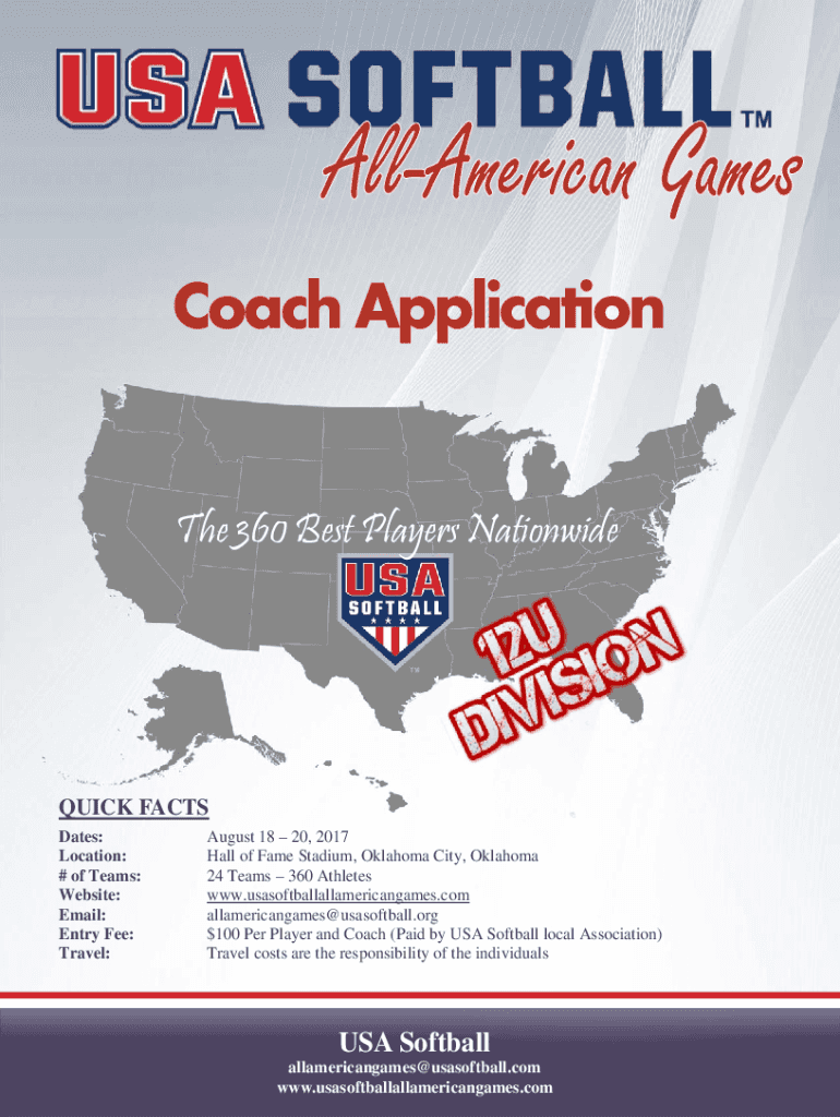 Coach Application The 360 Best Players NationwideQUICK FACTS Dates: Location: # of Teams: Website: Email: Entry Fee: Travel:August 18 20, 2017 Hall of Fame Stadium, Oklahoma City, Oklahoma 24 Teams