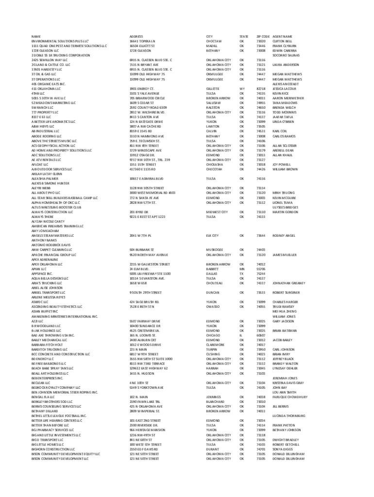 NAME ENVIRONMENTALSOLUTIONSPLUSLLC\' 1111QUADONEPESTANDTERMITESOLUTIONSLLC 1728GLEASONLLC 2DOBLESS1RTRUCKINGCORPORATION 2425SEMILLONWAYLLC 2GLAND&CATTLECO.LLC 37601HARDESTYLLC 3TOIL&GASLLC 3TOPERATIONSLLC