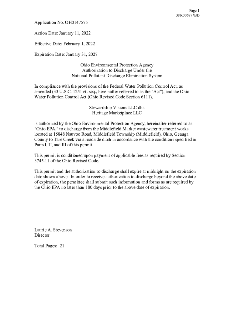 Page 1 3PR00697×Application No. OH0147575 Action Date: January 11, 2022, Effective Date: February 1, 2022, Expiration Date: January 31, 2027 Ohio Environmental Protection Agency Authorization to