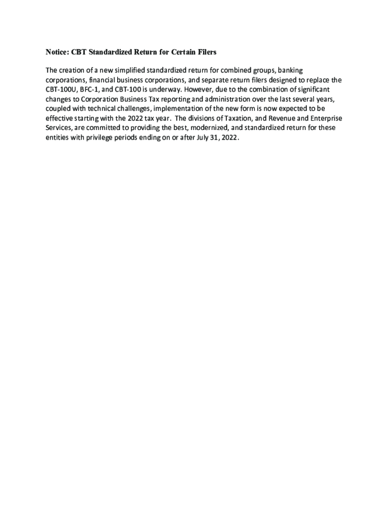 Notice: CBT Standardized Return for Certain Filers The creation of a new simplified standardized return for combined groups, banking corporations, financial business corporations, and separate return