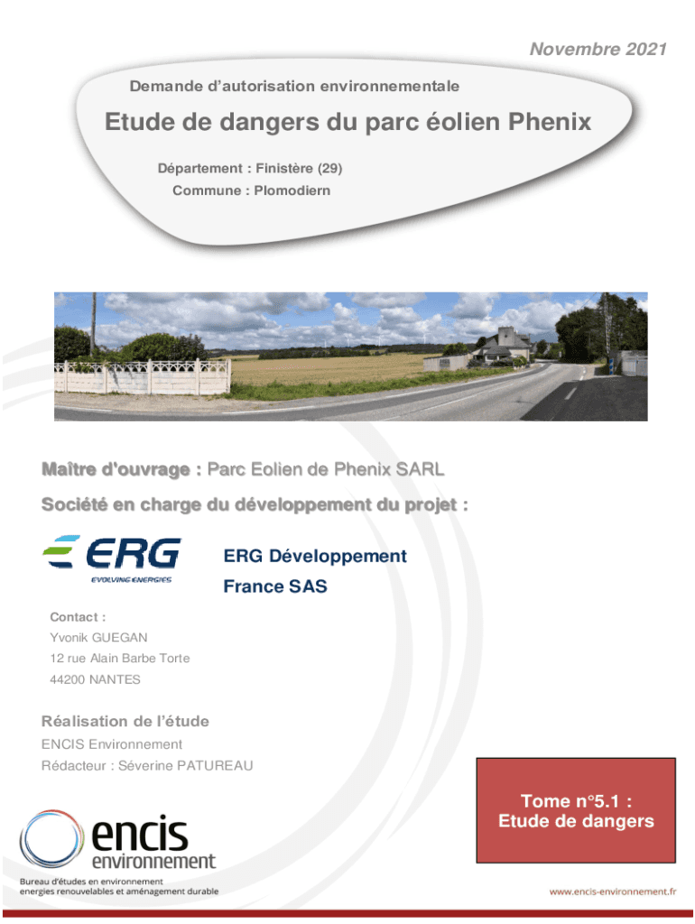 Elaboration DE étude DE dangers days LE cadre Du PARC alien Phoenix (Bloodier 29)November 2021Demande authorization environnementaleEtude de dangers Du PARC alien Phoenix