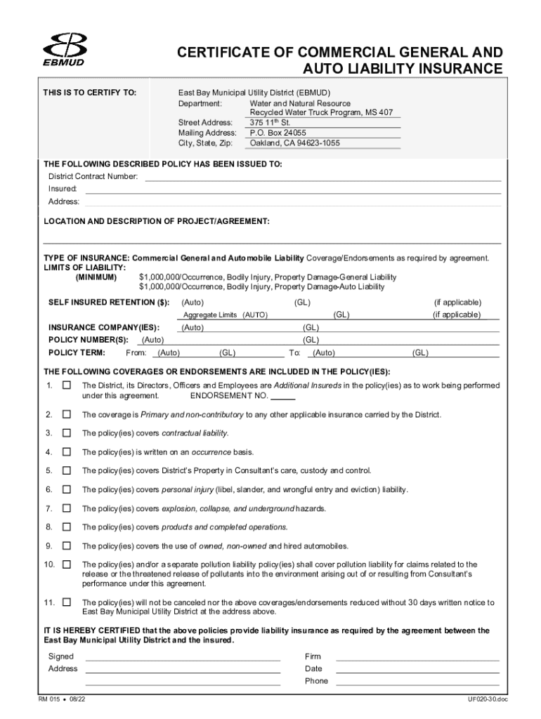 CERTIFICATE OF COMMERCIAL GENERAL AND AUTO LIABILITY INSURANCE THIS IS TO CERTIFY TO:East Bay Municipal Utility District (MUD) Department: Water and Natural Resource Recycled Water Truck Program,