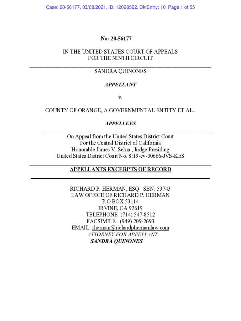 Case: 2056177, 03/08/2021, ID: 12028522, Entry: 10, Page 1 of 55No: 2056177 ___ IN THE UNITED STATES COURT OF APPEALS FOR THE NINTH CIRCUIT ___ SANDRA QUINONES APPELLANT v. COUNTY OF ORANGE, A GOVERNMENTAL