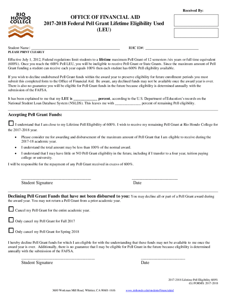 Received By:OFFICE OF FINANCIAL AID 20172018 Federal Well Grant Lifetime Eligibility Used (LED)Student Name:___RHC ID#:___PLEASE PRINT CLEARLYEffective July 1, 2012, Federal regulations limit students