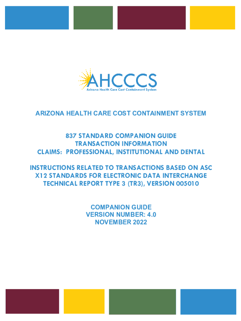 ARIZONA HEALTH CARE COST CONTAINMENT SYSTEM837 STANDARD COMPANION GUIDE TRANSACTION INFORMATION CLAIMS: PROFESSIONAL, INSTITUTIONAL AND DENTAL INSTRUCTIONS RELATED TO TRANSACTIONS BASED ON ASC X12