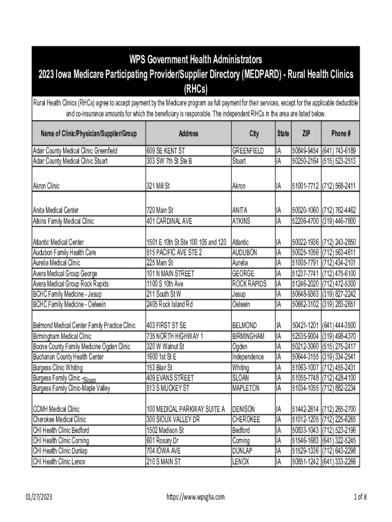 WPS Government Health Administrators 2023 Iowa Medicare Participating Provider/Supplier Directory (EDWARD) Rural Health Clinics (RCS) Rural Health Clinics (RCS) agree to accept payment by the Medicare