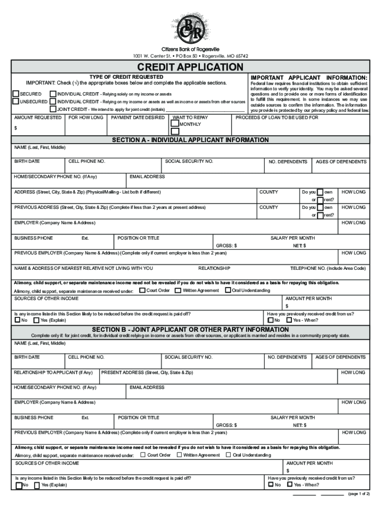 1001 W. Center St. PO Box 50 Ayersville, MO 65742CREDIT APPLICATION TYPE OF CREDIT REQUESTED IMPORTANT: Check () the appropriate boxes below and complete the applicable sections. IMPORTANT APPLICANTINFORMATION:Federal