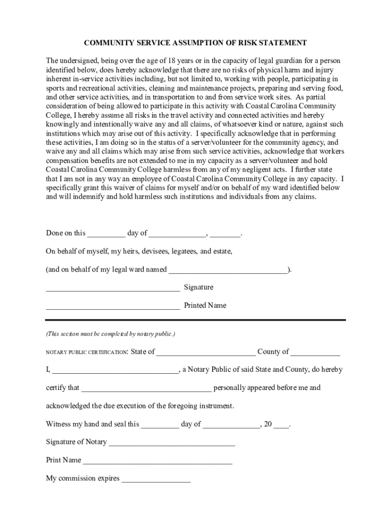 Get the free COMMUNITY SERVICE ASSUMPTION OF RISK STATEMENT