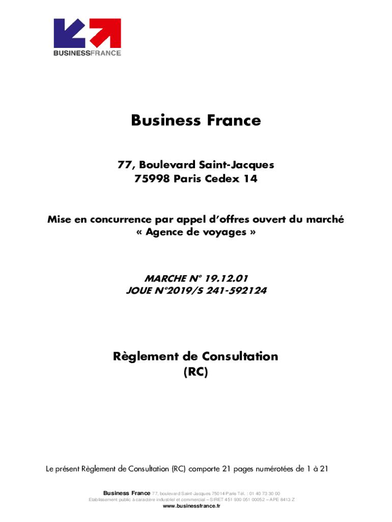 Business France 77, Boulevard Saint Jacques 75998 Paris CEDEX 14Mise en concurrence pa rappel doff res overt Du march Agency DE voyages MARCH N 19.12.01 JOE N2019/S 241592124Rglement de Consultation
