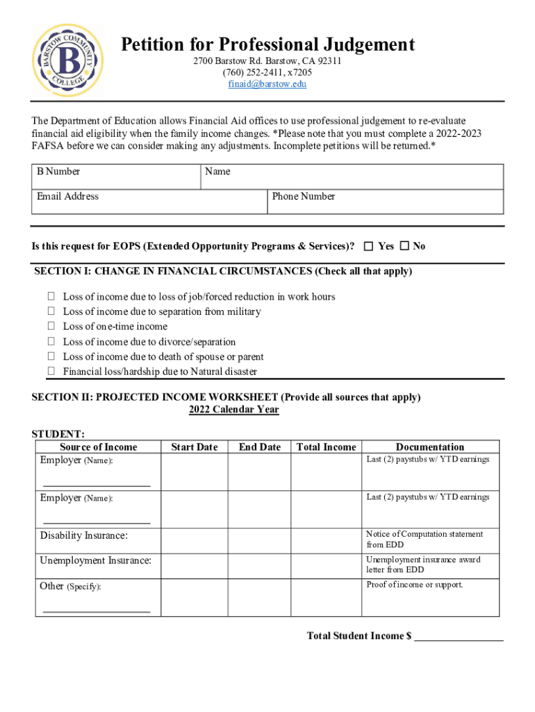 Petition for Professional Judgement 2700 Bar stow Rd. Bar stow, CA 92311 (760) 2522411, x7205 finaid@barstow.eduThe Department of Education allows Financial Aid offices to use professional judgement