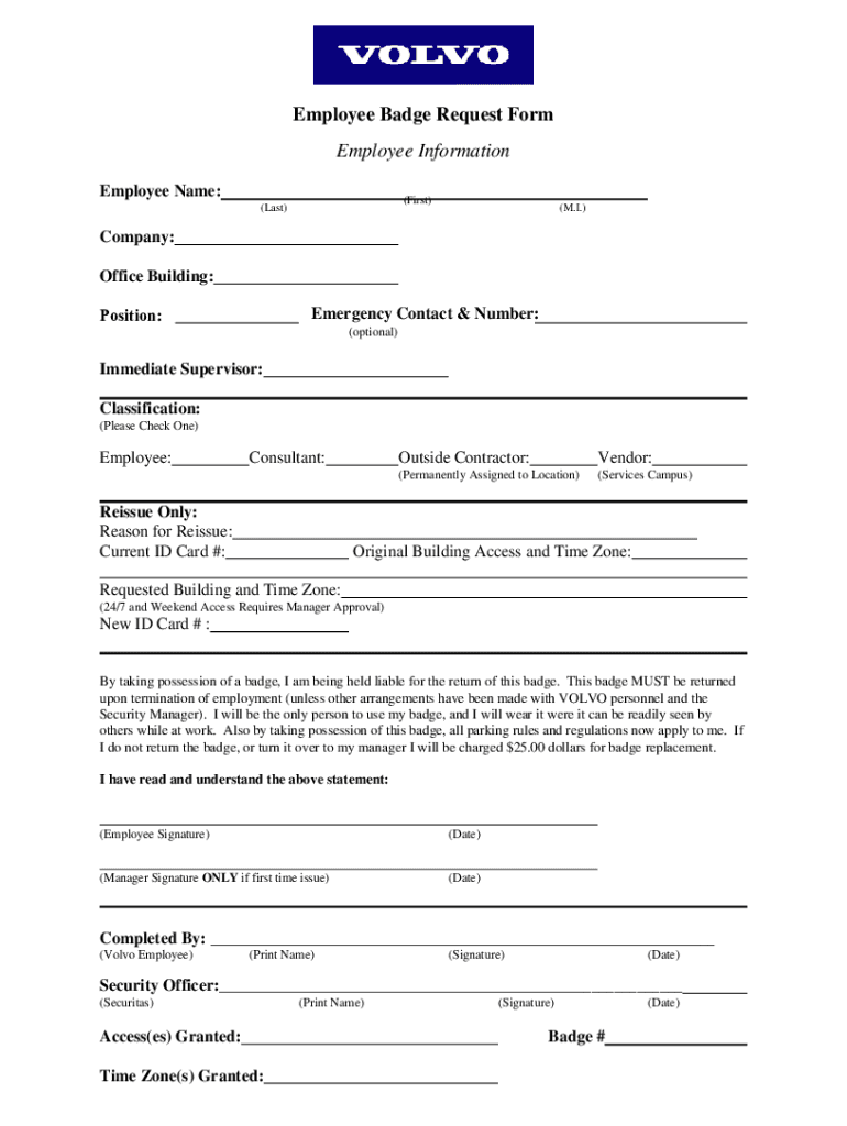 Employee Badge Request Form Employee Information Employee Name:(First)(Last)(M.I.) Company: Office Building: Position:Emergency Contact & Number: (optional)Immediate Supervisor: Classification: (Please