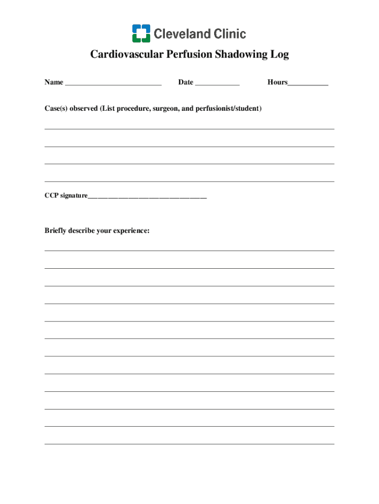 Cardiovascular Perfusion Shadowing Log Name ___Date ___Hours___Case(s) observed (List procedure, surgeon, and percussionist/student) ___ ___ ___ ___ CCP signature___Briefly describe your experience: