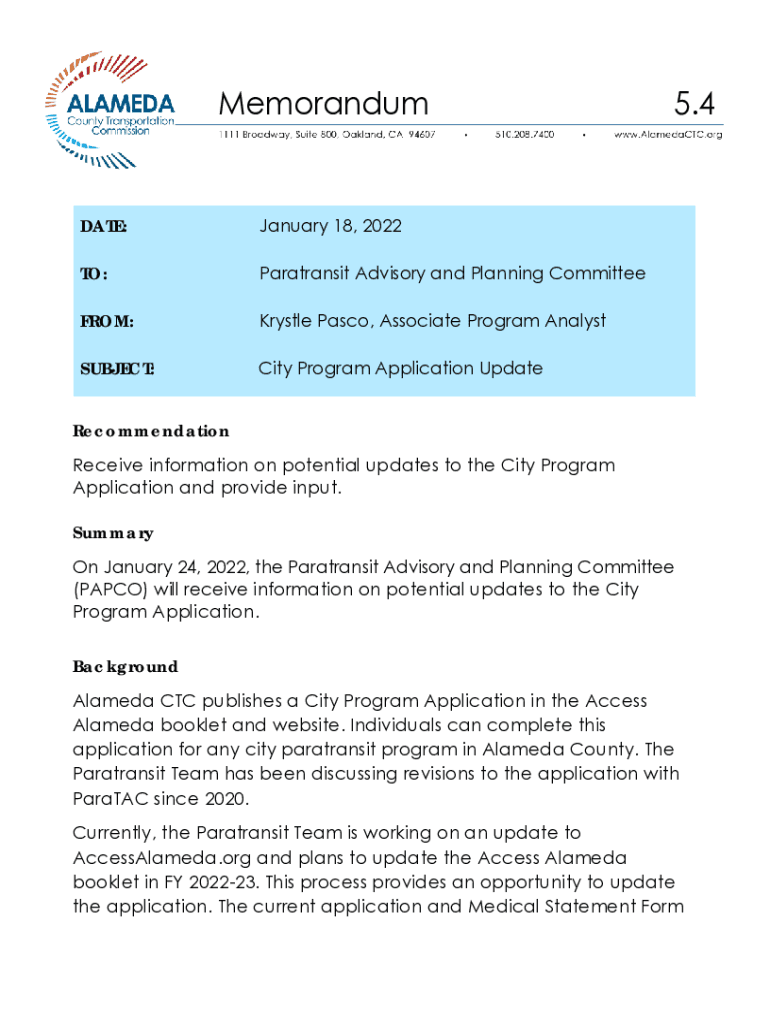 MemorandumDATE:January 18, 2022TO:Para transit Advisory and Planning CommitteeFROM:Wrestle Pasco, Associate Program AnalystSUBJECT:City Program Application Update5.4Recommendation