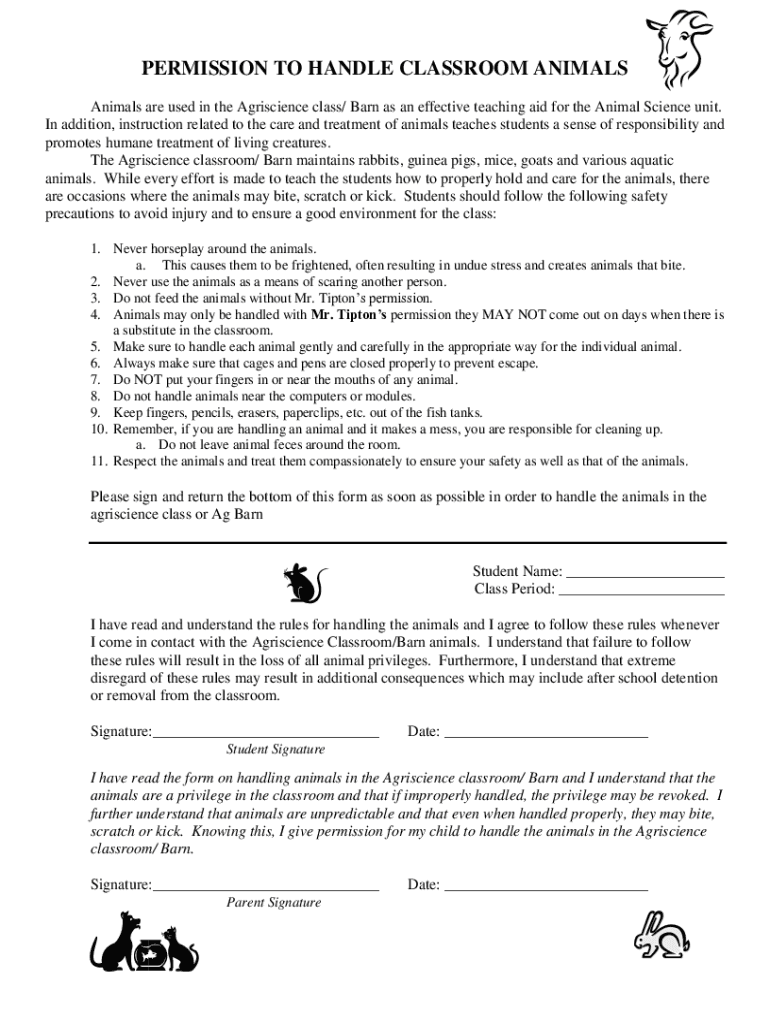 PERMISSION TO HANDLE CLASSROOM ANIMALS are used in the Agriscience class/ Barn as an effective teaching aid for the Animal Science unit. In addition, instruction related to the care and treatment