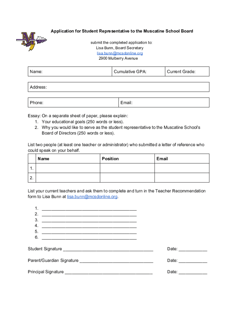 Application for Student Representative to the Mescaline School Board submit the completed application to: Lisa Burn, Board Secretary lisa.bunn@mcsdonline.org 2900 Mulberry AvenueName:Cumulative GPA:Current