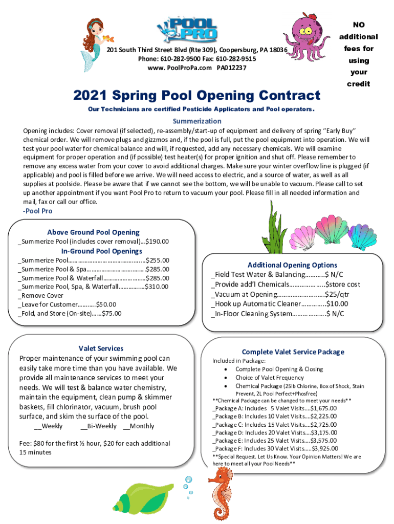 NO additional 201 South Third Street Blvd (Rte 309), Coopers burg, PA 18036 Phone: 6102829500 Fax: 6102829515 WWW. PoolProPa.com PA012237fees for2021 Spring Pool Opening Contract using your credit