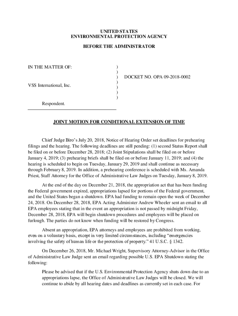 UNITED STATES ENVIRONMENTAL PROTECTION AGENCY BEFORE THE ADMINISTRATOR IN THE MATTER OF:VSS International, Inc.) ))))))DOCKET NO. OPA 0920180002Respondent. JOINT MOTION FOR CONDITIONAL EXTENSION OF