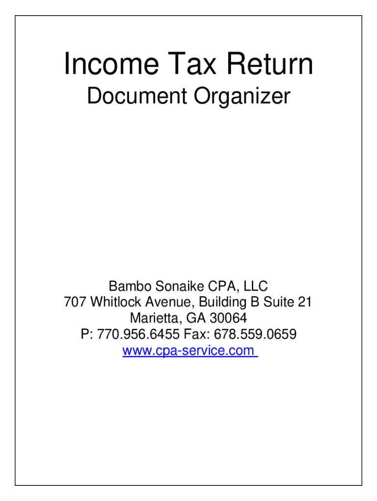 Income Tax Return Document OrganizerBambo Snake CPA, LLC 707 Whitlock Avenue, Building B Suite 21 Marietta, GA 30064 P: 770.956.6455 Fax: 678.559.0659 www.cpaservice.com2021 Tax Organizer Personal