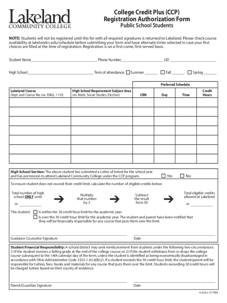 Get the free College Credit Plus (CCP) Registration Authorization Form