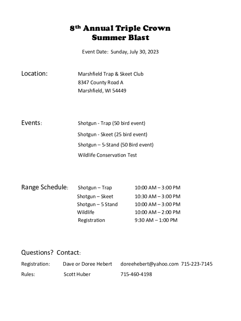 8th Annual Triple Crown Summer Blast Event Date: Sunday, July 30, 2023Location:Marsh field Trap & Skeet Club 8347 County Road A Marsh field, WI 54449Events:Shotgun Trap (50 bird event) Shotgun Skeet