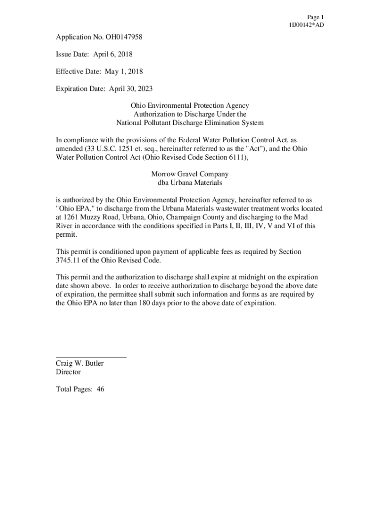 Page 1 1IJ00142×Application No. OH0147958 Issue Date: April 6, 2018, Effective Date: May 1, 2018, Expiration Date: April 30, 2023, Ohio Environmental Protection Agency Authorization to Discharge