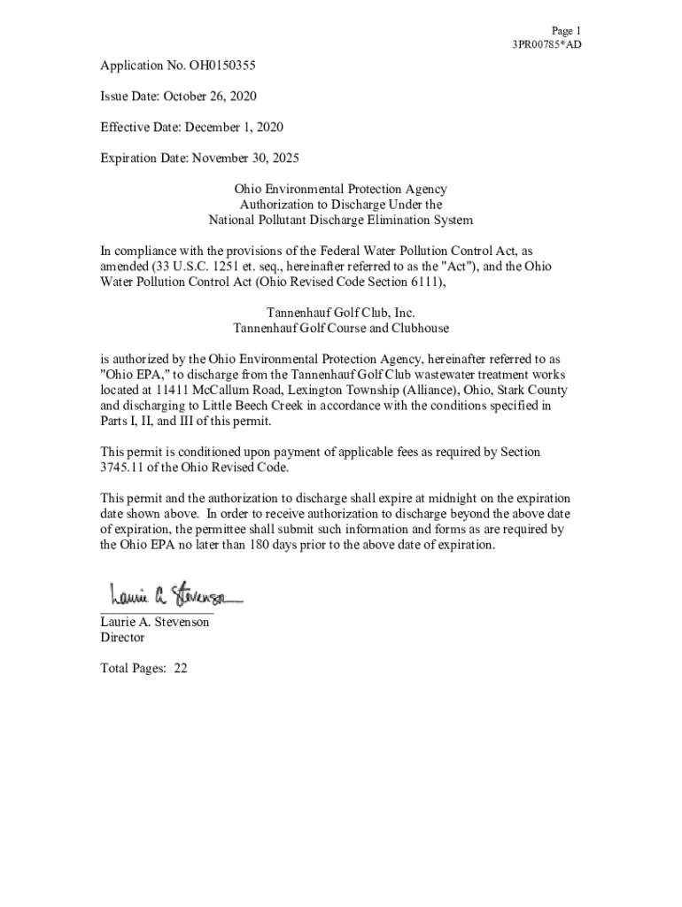 Page 1 3PR00785×Application No. OH0150355 Issue Date: October 26, 2020, Effective Date: December 1, 2020, Expiration Date: November 30, 2025 Ohio Environmental Protection Agency Authorization to