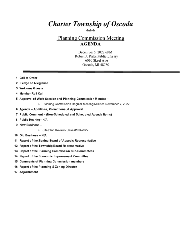 Charter Township of Os coda ***Planning Commission Meeting AGENDA December 5, 2022 6PM Robert J. Parks Public Library 6010 Steel Ave Os coda, MI 48750 1. Call to Order 2. Pledge of Allegiance 3. Welcome