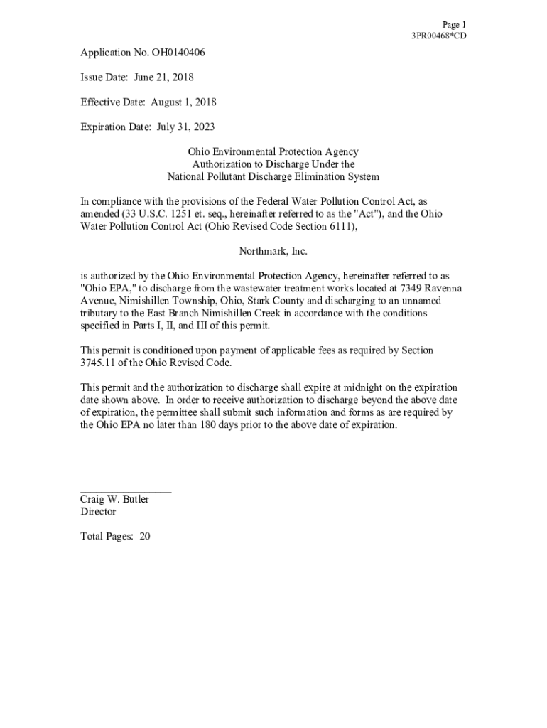 Page 1 3PR00468×Application No. OH0140406 Issue Date: June 21, 2018, Effective Date: August 1, 2018, Expiration Date: July 31, 2023, Ohio Environmental Protection Agency Authorization to Discharge