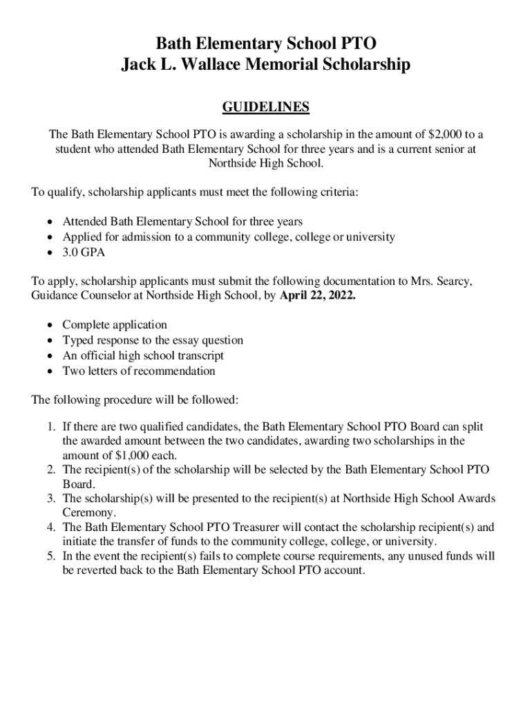 Bath Elementary School PTO Jack L. Wallace Memorial Scholarship GUIDELINES The Bath Elementary School PTO is awarding a scholarship in the amount of $2,000 to a student who attended Bath Elementary