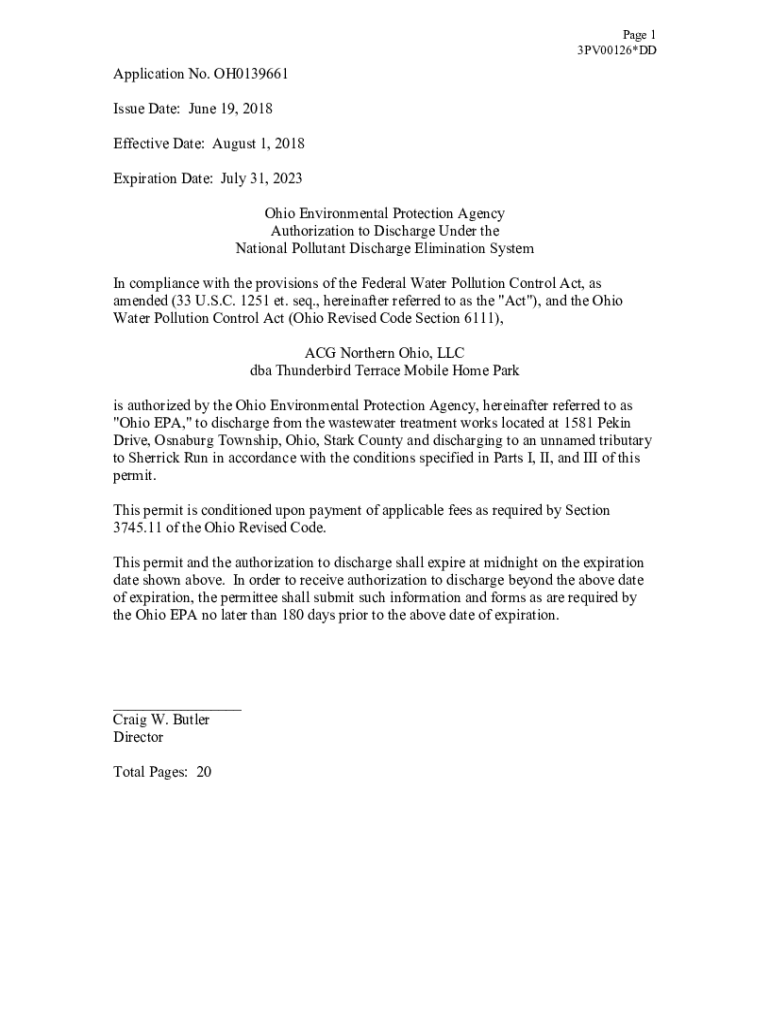 Page 1 3PV00126×Application No. OH0139661 Issue Date: June 19, 2018, Effective Date: August 1, 2018, Expiration Date: July 31, 2023, Ohio Environmental Protection Agency Authorization to Discharge