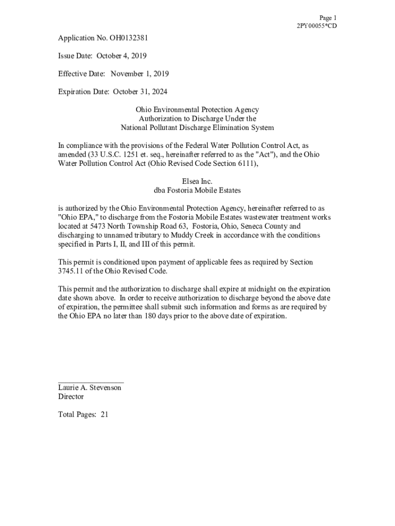 Page 1 2PY00055×Application No. OH0132381 Issue Date: October 4, 2019, Effective Date: November 1, 2019, Expiration Date: October 31, 2024 Ohio Environmental Protection Agency Authorization to Discharge
