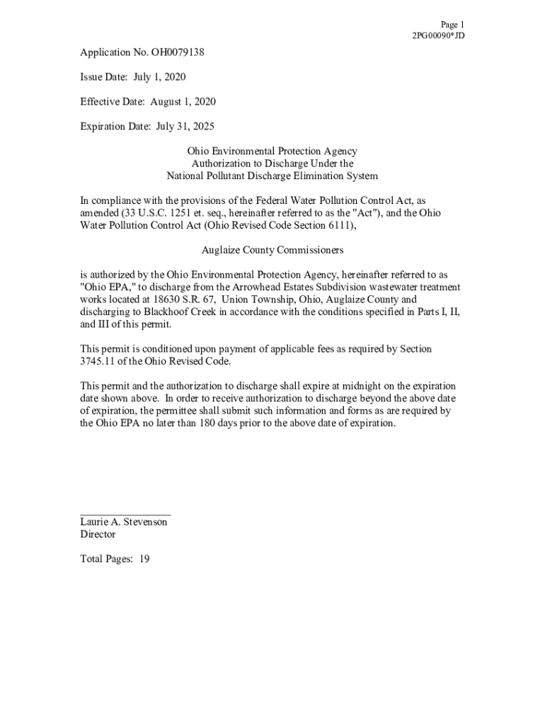 Page 1 2PG00090×Application No. OH0079138 Issue Date: July 1, 2020, Effective Date: August 1, 2020, Expiration Date: July 31, 2025 Ohio Environmental Protection Agency Authorization to Discharge