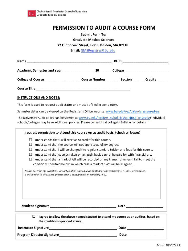 Chobianian & Redesign School of Medicine Graduate Medical SciencePERMISSION TO AUDIT A COURSE FORM Submit Form To: Graduate Medical Sciences 72 E. Concord Street, L309, Boston, MA 02118 Email: GMSRegistrar@bu.edu