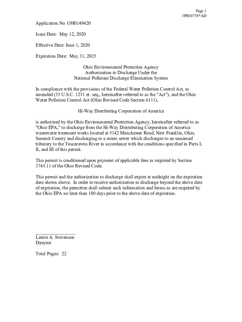 Page 1 3PR00759×Application No. OH0149420 Issue Date: May 12, 2020, Effective Date: June 1, 2020, Expiration Date: May 31, 2025 Ohio Environmental Protection Agency Authorization to Discharge Under