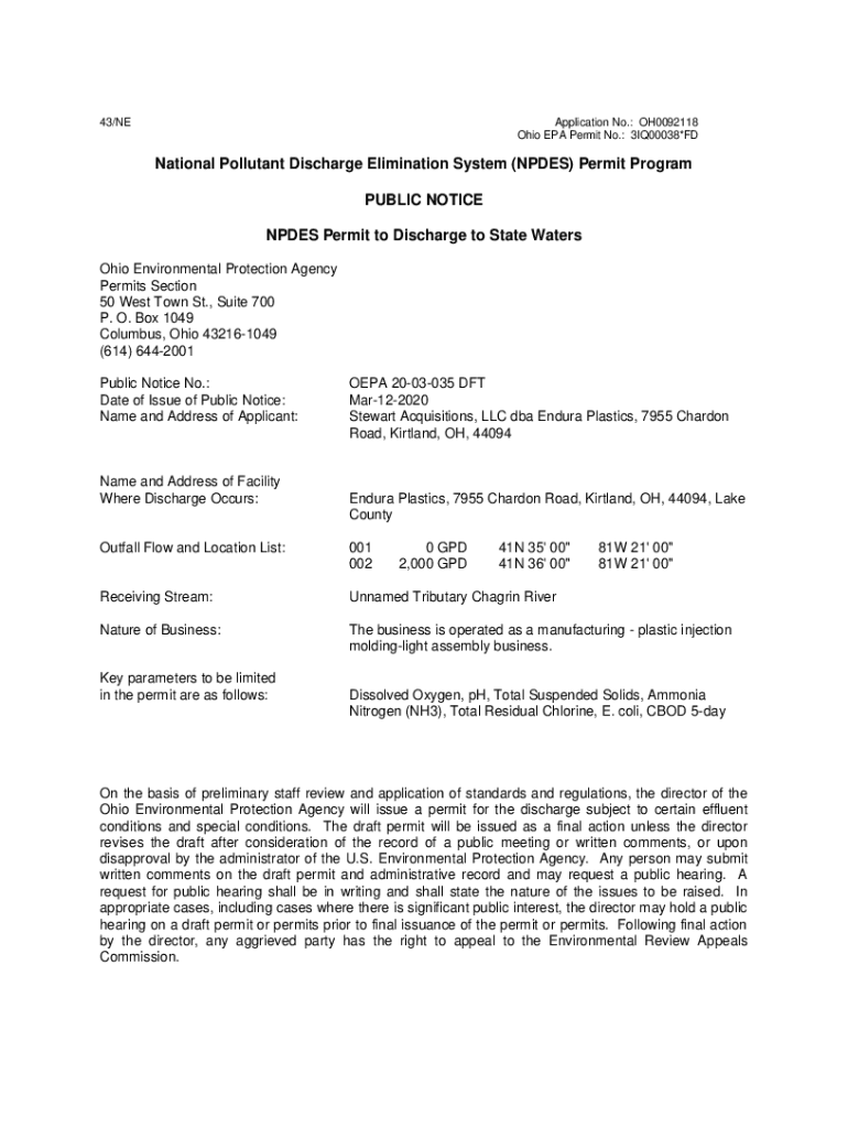 43/Reapplication No.: OH0092118 Ohio EPA Permit No.: 3IQ00038×National Pollutant Discharge Elimination System (NODES) Permit Program PUBLIC NOTICE NODES Permit to Discharge to State Waters Ohio Environmental
