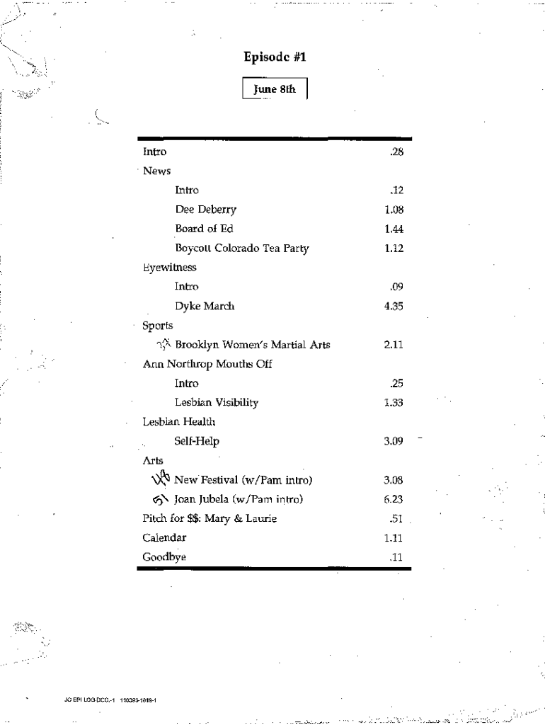 Episode #1 June 8thIntro.28News Intro.12Dee Deberry1.08Board of Ed1.44Boycott Colorado Tea Party1.12Eyewitness Intro.09Dyke March4.35Sports \', \” X, Brooklyn Women\'s Martial Arts2.11Ann Northrop