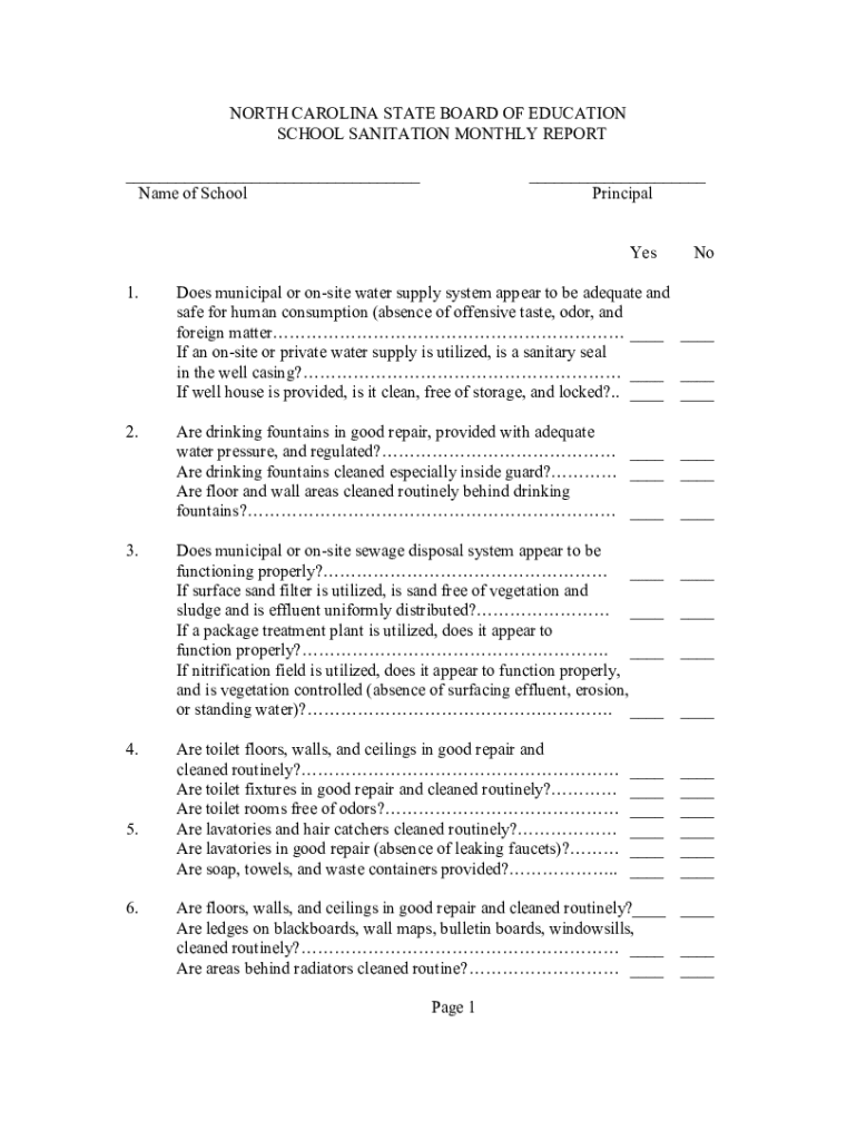 NORTH CAROLINA STATE BOARD OF EDUCATION SCHOOL SANITATION MONTHLY REPORT ___ Name of School___ PrincipalYesNo1. Does municipal or onsite water supply system appear to be adequate and safe for human