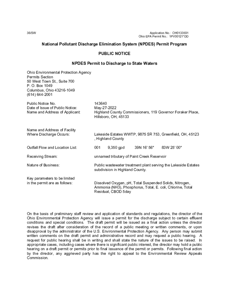 36/Application No.: OH0133591 Ohio EPA Permit No.: 1PV00121×National Pollutant Discharge Elimination System (NODES) Permit Program PUBLIC NOTICE NODES Permit to Discharge to State Waters Ohio Environmental