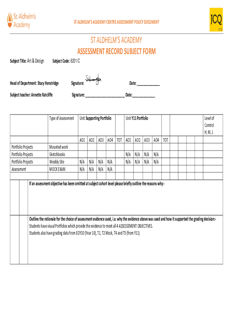 ST ALCHEMY ACADEMY Center ASSESSMENT POLICY DOCUMENTS ALCHEMY ACADEMY ASSESSMENT RECORD SUBJECT FORM Subject Title: Art & DesignSubject Code: 8201/Head of Department: Stacy HenstridgeSignature:Subject