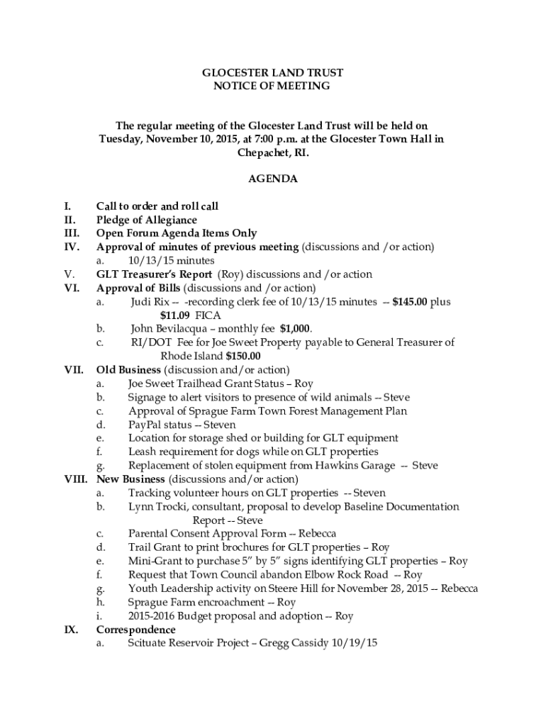 GLOUCESTER LAND TRUST NOTICE OF MEETING The regular meeting of the Gloucester Land Trust will be held on Tuesday, November 10, 2015, at 7:00 p.m. at the Gloucester Town Hall in Chechen, RI. AGENDA