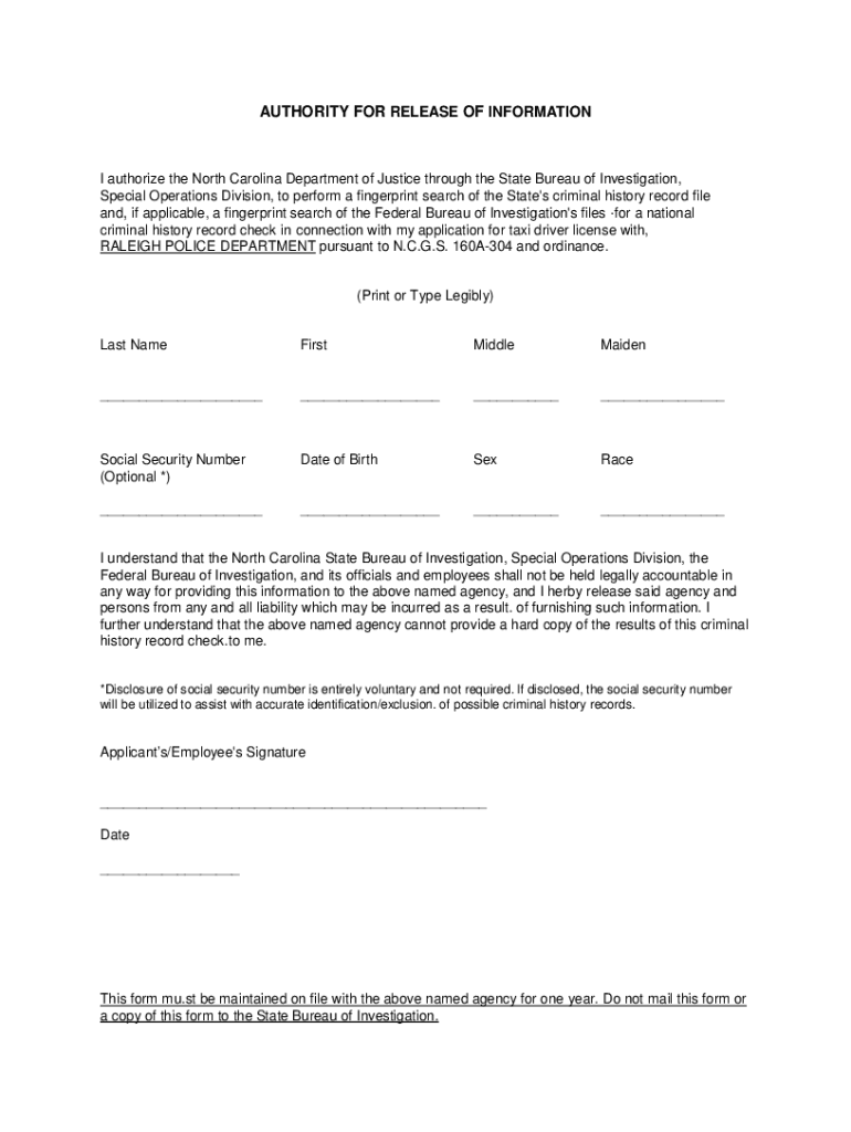 AUTHORITY FOR RELEASE OF INFORMATION authorize the North Carolina Department of Justice through the State Bureau of Investigation, Special Operations Division, to perform a fingerprint search of the