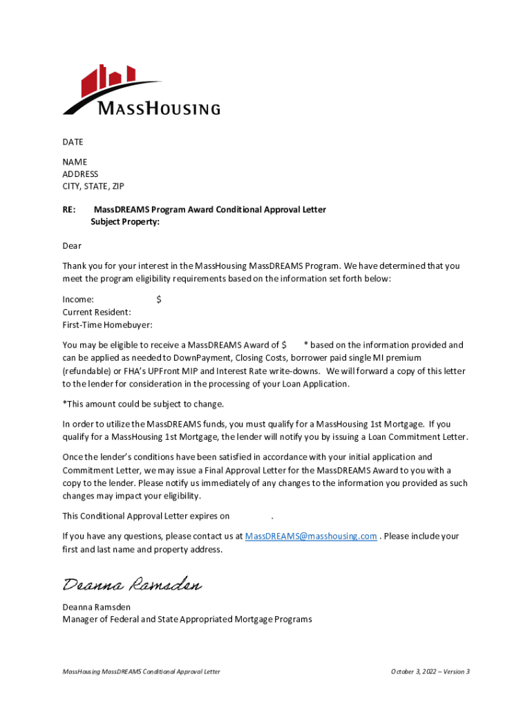 Get the free MassDREAMS Program Award Conditional Approval Letter Subject ...