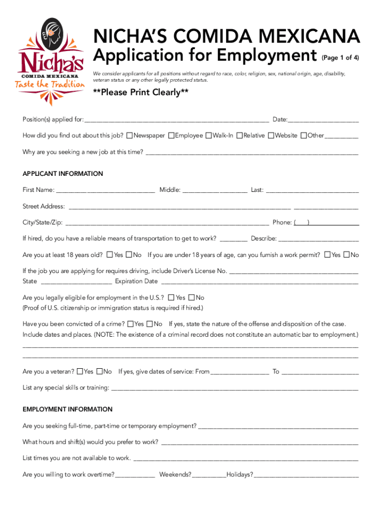 NICHES COMING MEXICAN Application for Employment(Page 1 of 4)We consider applicants for all positions without regard to race, color, religion, sex, national origin, age, disability, veteran status