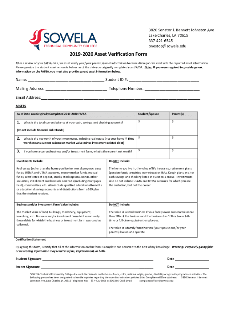 3820 Senator J. Bennett Johnston Ave Lake Charles, LA 70615 3374216545 onestop@sowela.edu20192020 Asset Verification Form After a review of your FAFSA data, we must verify your/your parent(s) asset
