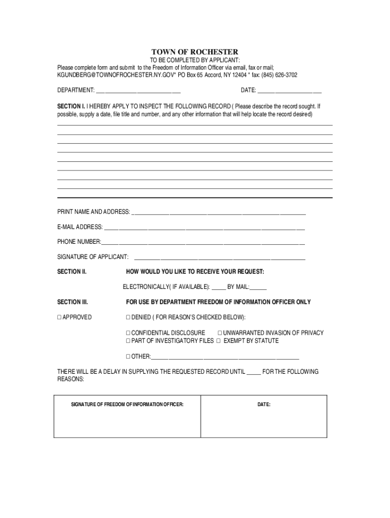 TOWN OF ROCHESTER BE COMPLETED BY APPLICANT: Please complete form and submit to the Freedom of Information Officer via email, fax or mail; KGUNDBERG@TOWNOFROCHESTER.NY.GOV* PO Box 65 Accord, NY 12404