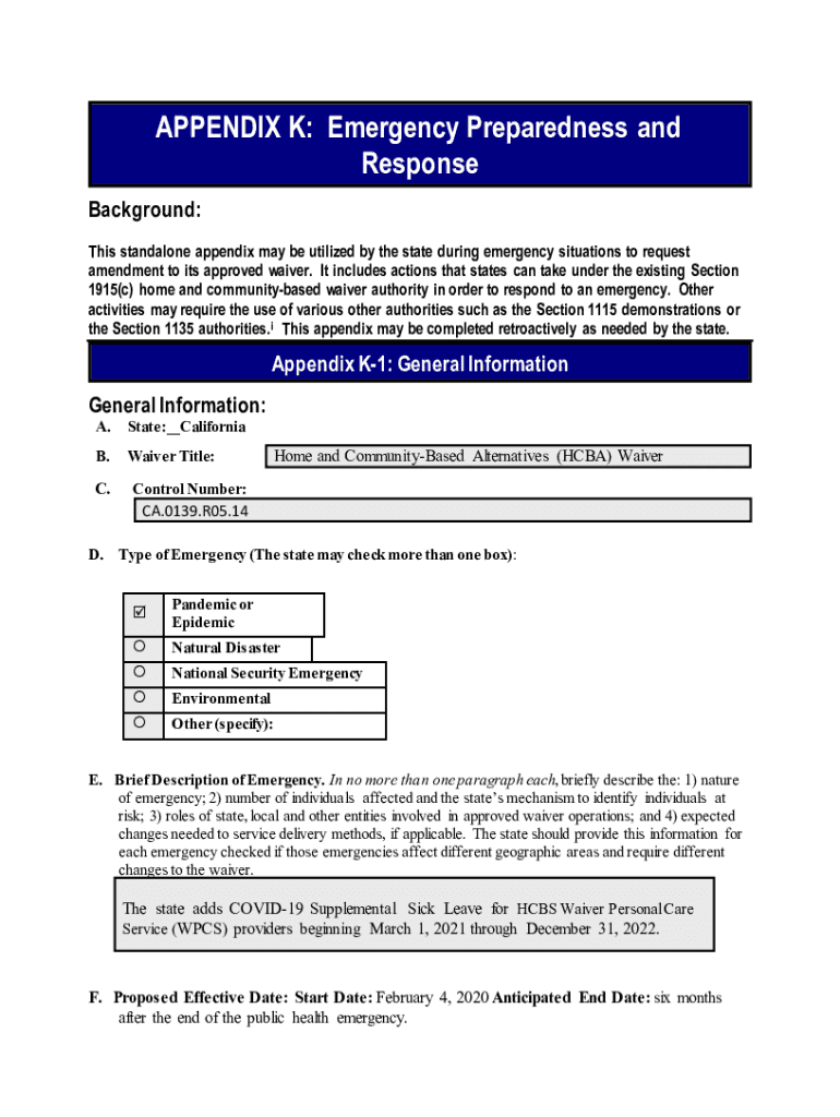 APPENDIX K: Emergency Preparedness and Response Background: This standalone appendix may be utilized by the state during emergency situations to request amendment to its approved waiver. It includes