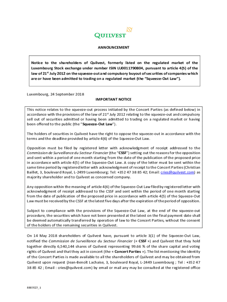 Communique Quilvest re prix is a formal communication document related to pricing or other financial disclosures required by Quilvest.
