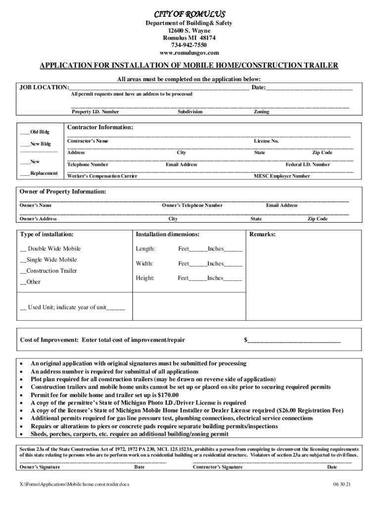 CITY OF ROMULUS Department of Building Safety 12600 S. Wayne Romulus MI 48174 7349427550 www.romulusgov.comAPPLICATION FOR INSTALLATION OF MOBILE HOME/CONSTRUCTION TRAILER All areas must be completed