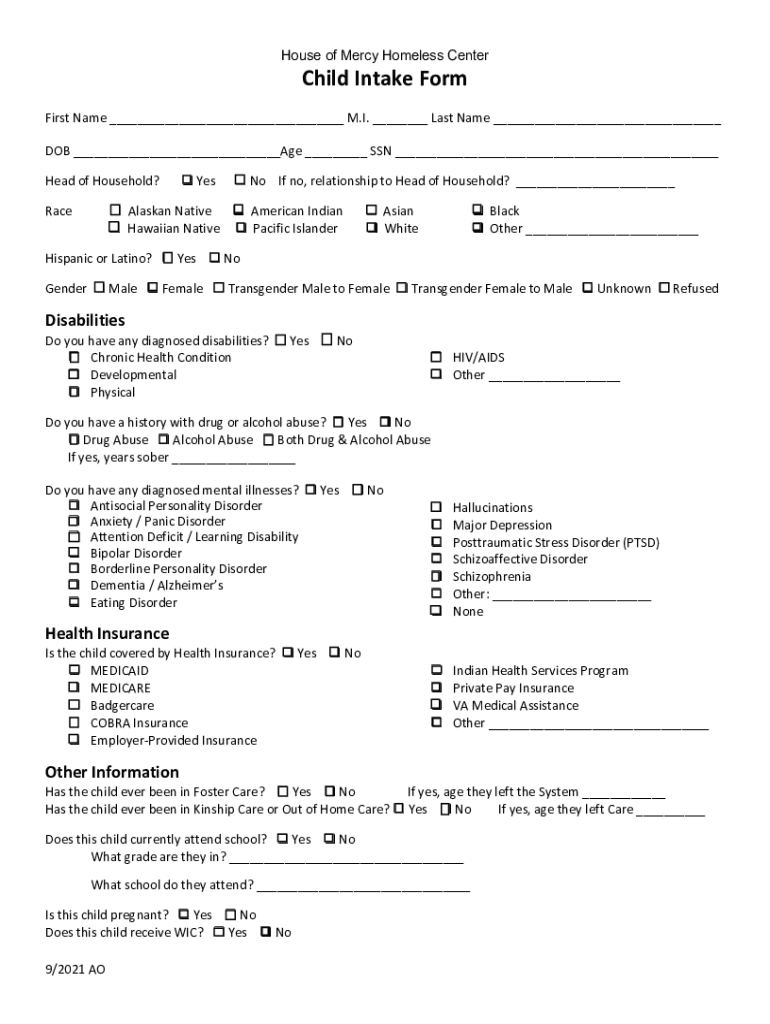 House of Mercy Homeless Centerfold Intake Form First Name ___ M.I. ___ Last Name ___ DOB ___Age ___ SSN ___ Head of Household? Race Yes Now If no, relationship to Head of Household? ___q Alaskan Native
