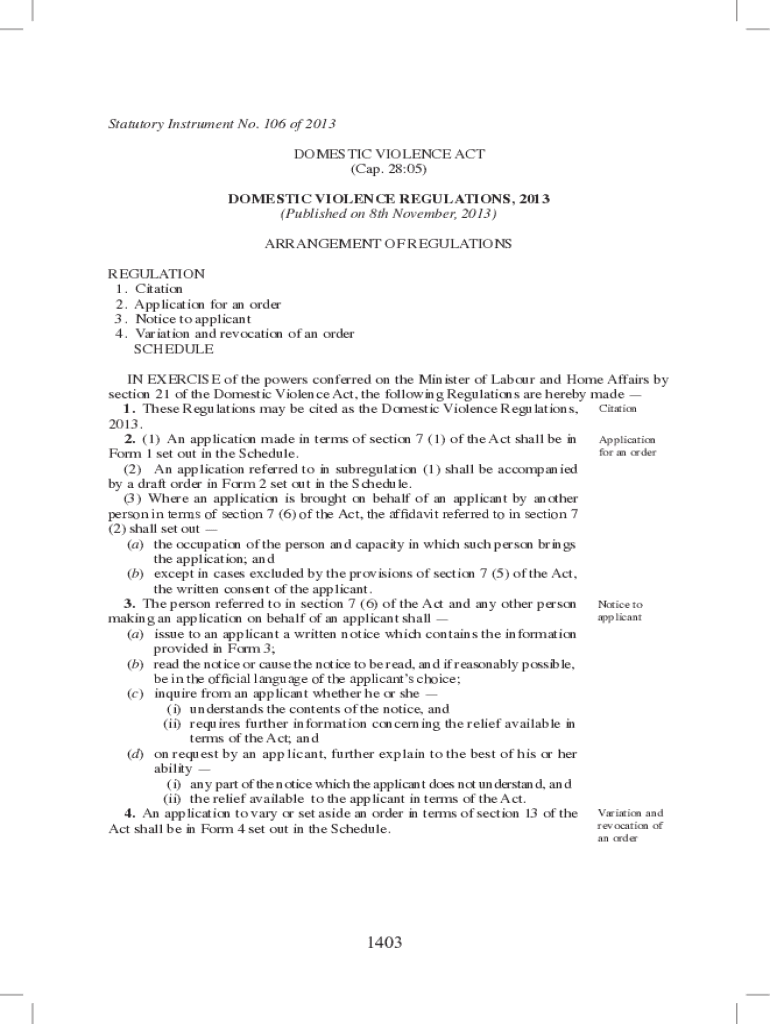BLUE BOOK BOTSWANA.1071Statutory Instrument No. 106 of 2013 DOMESTIC VIOLENCE ACT (Cap. 28:05) DOMESTIC VIOLENCE REGULATIONS, 2013 (Published on 8th November 2013) ARRANGEMENT OF REGULATIONS REGULATION
